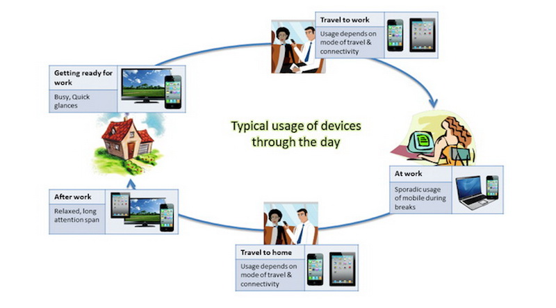 简单描述上图,早晨,用户从起床开始就通过智能手机或电脑快速浏览信息;在去公司和回家的路途中,会使用到智能手机和平板电脑,其使用取决于出行的方式和方便程度;在工作中主要使用电脑,偶尔会使用手机;下班到家后,处于相对放松的状态,会同时使用台式电脑、平板电脑和智能手机。简而言之,用户的一天中,会接触到多种终端设备,包括电脑和移动设备。