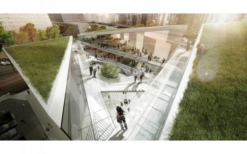该Beach and Howe综合摩天大楼由BIG、Westbank、Dialog、Cobalt、PFS、Buro Happold、Glotman Simpson、及温哥华当地建筑师James Cheng共同设计,高490英尺(149.35米),它将定义温哥华商业区的入口标志,形成城市的欢迎大门,同时为温哥华的天际线增添独特结构。 建筑49层高,共有600个住在单位,是城市第四高建筑。塔楼有着9层高的裙房提供办公空间、餐饮和零售等商业空间。开发商认为这个项目是世界一流的,创造性,可持续性的,改变了城市天际线,成为城市中的一个特别存在。因为桥和公路从场地跨过,将场地切分为三角形。塔楼的基地也是三角形,充分考虑与邻里的关系,避开繁忙的交通,吸纳阳光。