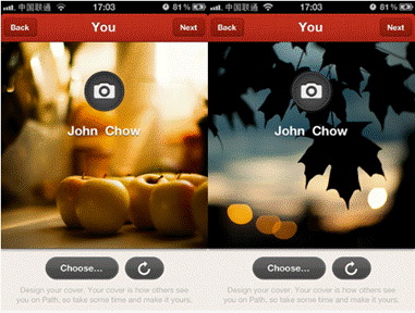 令人耳目一新的华丽界面,当用户登录新版本的Path时,将可以按照自己的喜好更换自己主页的背景图片,用户可以通过自定义这张“背景图片”,来向好友们展现自己的审美观念,有点个人博客的感觉。这里处理头像的手法也是相当的精致,很巧妙的和主页背景COVER所结合,配以醒目的英文名字和基本信息作为主页标题,整款APPS在首页进入就带给人们不一样的精致度,再加上IOS显示的精细度,将这款转型后的Path展现的凌厉尽致。可以用几个关键词来形容:革命突破性的颠覆;最具独特的创新转型;与同类产品的竞争潜力提升百倍。