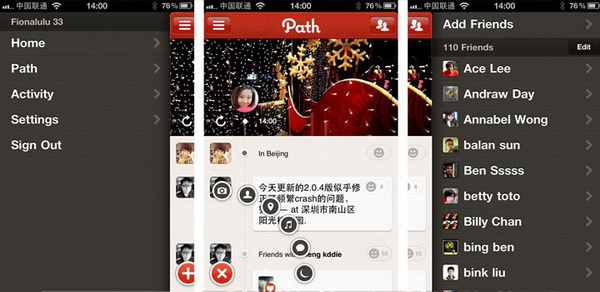 UI界面做的也是非常的精致,非常符合时下文艺小青年的审美调子,欢迎大家在上面分享各种有意思的图片哇! Instagram 在移动端融入了很多社会化元素,包括好友关系的建立、回复、分享和收藏等,这是Instagram 作为服务存在而非应用存在最大的价值。 但非所有的图片分享工具都赞同开放的社交图片与路线,另外一家图片拍摄与分享服务商Path就坚持“私密分享”的另一种选择。 Path:这个APPS是非常值得一提的一款应用程序,这是由两个前 Facebook 员工精心打造出来的“密友社交平台”已经突破了 100 万的用户数量,它在这次2.0改版之后,做了一个华丽光鲜的转身,把许多同类产品都遥遥的甩在了身后。直接领跑整个图片类社交分享圈子,无论是在功能和界面设计上都做的相当的精致出位,很受大家的喜爱追捧。 Path其实是一个私人图片社交圈子,它只能够添加你最亲密的50人作为好友,它让你不能不想部分受众SAY NO。这样也同时很好的建立起互联网上第三种社交网络类别。2.0的path是模拟了一本智能杂志的形式,可以帮助您分享生活,爱人,你的想法,你听的好听的歌曲,视频。新版更增加了时间轴排列的信息,让你更加清晰的看来一路走来的时间、地点、人物和事件,更加好的帮助回忆过往发生的事情。新版还添加了有意思的唤醒功能,当你睡觉和醒来的瞬间,只要玩过Path,就可以轻松识别您的地理位置和睡觉的时间,让你最私密的好友们最清晰的第一时间了解你的动态。还可以让你的朋友知道你在哪里共享路径上的地方。同时也可以看到你好友添加了哪些朋友,从而加密关系链。 最惊艳的是其主页的版式,很大气简洁的排版,也充分的展示了所需的基本信息。新增的一些功能也开始彰显出设计团队对于私密朋友间社交模式的新思考。