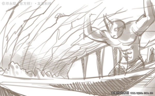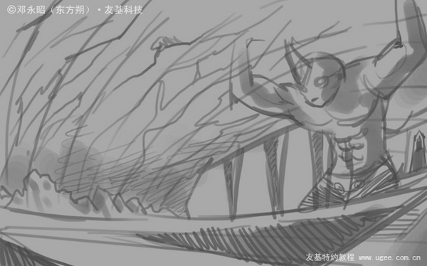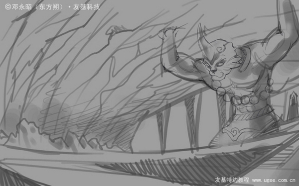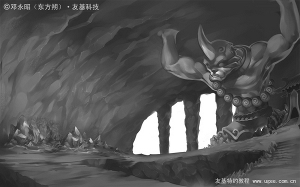 2.去掉透视线,继续设计构图。这是一个山洞,在洞穴中加一个用石头雕刻出来的妖怪,呈现双手托举洞顶的动作,看起来像是守护这座山洞的洞妖。