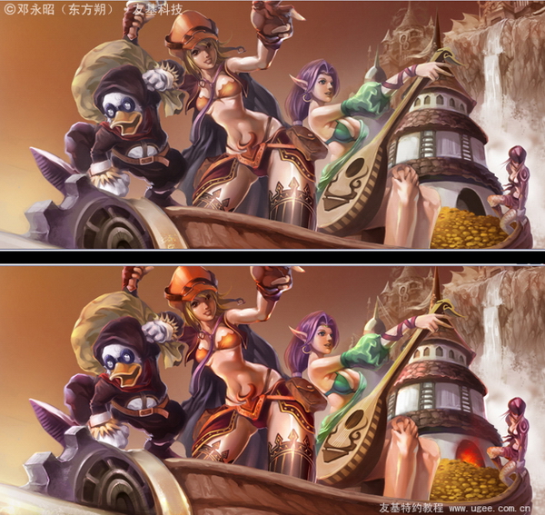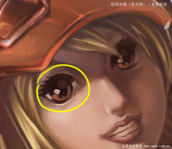对一些细节部位(如图黄圈所示的位置)进行高光处理,令整体画面增加亮点,使画面更加生动。