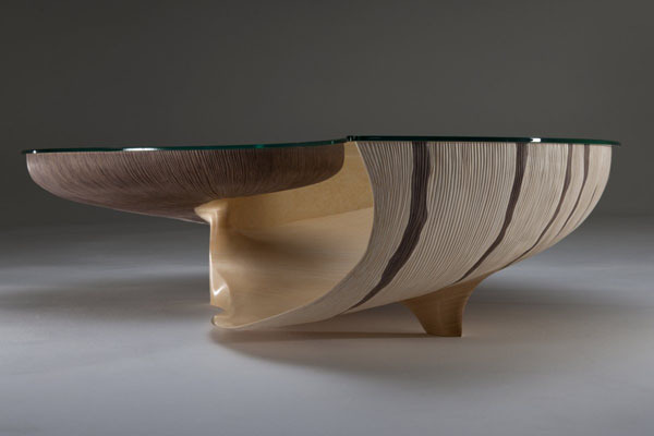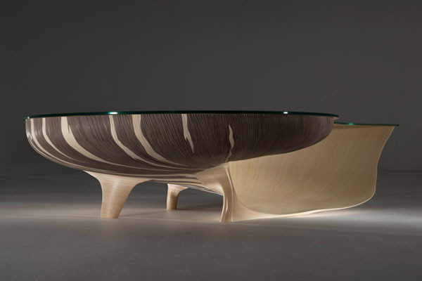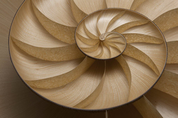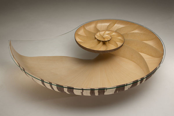 英国的家具设计师 Marc Fish 推出了他的第二款〝Nautilus II(鹦鹉螺 II)〞桌子设计,拜最新计算机科技所赐,以计算机运算与创新的建筑技术结合,完成了这个目前为止还无法超越的黄金比例家具设计。以超过 4000 片独立的核桃木与枫木压合成鹦鹉螺的壳,完全遵照由大自然所发展出来的黄金比例制作,这也是 Marc Fish 的灵感来源。以手工雕刻外部凹槽,模拟螺壳自然生长的花纹。而内部除了抛光的亮面内壳,还利用日式花边纸来隔出每个腔室,当然,也是黄金比例!