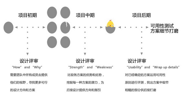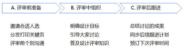 正如上述图文所示,真正意义的设计评审可以帮助设计师改进方案,为设计和产品指引方向,而不好的设计评审会给设计带来很多困扰,甚至还不如不做设计评审。 如何做一个有意义的设计评审? 设计评审有两大种,一种设计师的评审(参与人员全是设计师),一种是和项目组的设计评审。因为拥有相同的背景,设计师之间的评审一般沟通起来并不存在太多问题。本文重点在讲项目组内的设计评审。在项目组设计评审中与会人员最好保持在4-8人左右,这个也来自高效会议原则。人员背景则最好来自不同专业,可以给项目带来更多不同的视野。至于在项目组如何做设计评审,个人认为可以分为三个阶段。如下图所示: