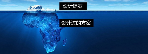 有些参与设计评审人员在评审中会持续的挑战设计方案,他们经常会问的问题“为什么要按照A设计”和“为什么按照B设计”。挑战设计本身不存在任何问题,很多情况下是可以激发大家去寻找新的更优的思路。但在挑战下,人类本能就是去捍卫自己的观点。设计师也不例外,持续的挑战,让设计师会思考如何捍卫当前方案或改进当前方案。一定程度上,这也帮助了设计方案的优化。不利的因素也非常明显,设计师和参与评审人员的思维都限制在当前方案上,偏离了寻找“更多”和“更优”的设计思路的初衷。这就像人们经常说的,“为了一颗树,放弃了整片森林”。 设计师应如何应对设计评审中出现的问题? A. 准备充分,否则推迟评审时间 如下图所示,设计师在设计评审中提案就像冰山露在海面上的部分一样,其实只是一小部分,而设计过的方案可能就像海面下更大部分。因为设计本身是一个发散和创造的过程,会有很多种方法达到产品目标。而设计师的工作就是在众多方法中寻找到最优的方案并呈现出来。如果在设计评审前没有把诸多方案想透的话就参加评审,评审中很容易出现方案被质疑的状况,被质疑后方案可能还需要重新做,浪费了时间也浪费人力。因此,在设计评审前一定要尽可能探索所有可能的方案,否则不如推迟评审时间。