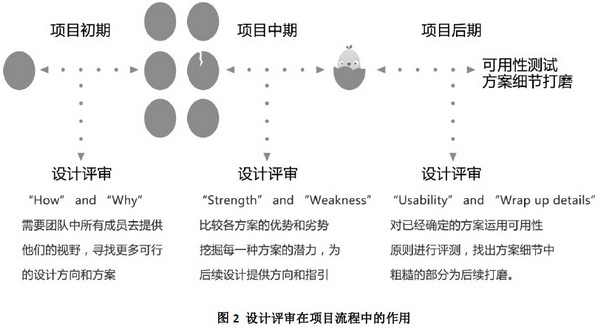 设计评审有两大种,一种是设计师的评审(参与人员全是设计师),另一种是项目组的设计评审。前者的评审人员因为拥有相同的知识背景,沟通起来一般不存在太多问题。本文重点讲项目组内的设计评审。在项目组设计评审中与会人员最好保持在4-8人左右,这是一个高效会议原则。人员背景最好来自不同专业,这样可以给项目评审带来更多不同的视野。至于如何进行设计评审,个人认为可以分为三个阶段。如图2[1]所示: