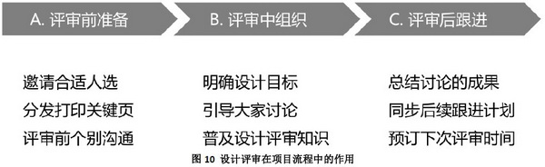 如图10所示分了三个阶段,首先要在设计评审前做充分的准备,评审中组织讨论和评审后跟进。每个阶段下都列举了一些小方法,这些方法使用时要因地制宜。总体来说,设计师要想主导设计评审,需要在评审前对每个环节都进行充分准备,这些细小的环节,会让设计师在项目组中更具影响力,最后达到推动设计评审高效进行,体现设计师专业性的最终目的。
