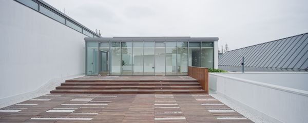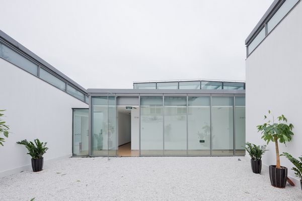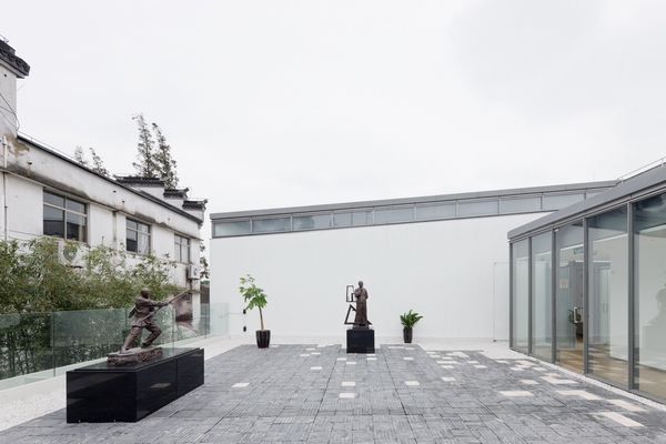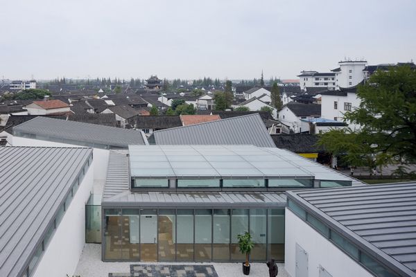 项目位于上海保存最完整的水乡古镇的入口处,建筑中心的室内中庭是动线的核心,分散的展室籍由中庭外圈的环廊联系在一起,展厅之间则形成了气氛各异的庭院,收纳着周围的风景。