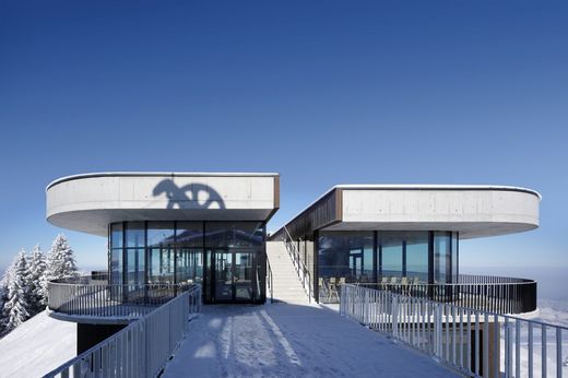该项目是由Markus Innauer, Bernd Frick设计的。建筑形状、方向、内部结构清晰而大胆的设计开发了全景餐厅现有的地形。整个建筑靠着山坡的山脊。外部楼梯道屋顶露台是继原有的地形并且把建筑分成两部分。到不同的方向一览无余显示的序列空间的开放性,有内部和外部之间的平滑过渡。餐厅地板的特点是宽的水平玻璃面上面画有大自然的元素。该建筑的外观是混凝土和玻璃组成的,而室内采用的主要是当地的木材。相比之下,黑色的木材用在饭店的地板和天花板上,所有的独立的区域和全部餐厅设施都是淡棕色的。