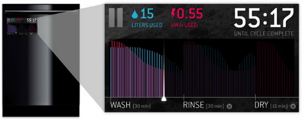 让我们看一看,怎么做能够优化一台洗碗机的使用体验。在整台设备正面的玻璃嵌板后,我们放上一个触摸屏幕,让它易于清洁的同时也拥有了一种“简洁”的美。它包含时钟、剩余时间指示和功率显示。触摸屏的好处不仅在于看起来漂亮和引人注目,还能够在不需要的时候关闭,用户在想看的时候只显示相关的信息。