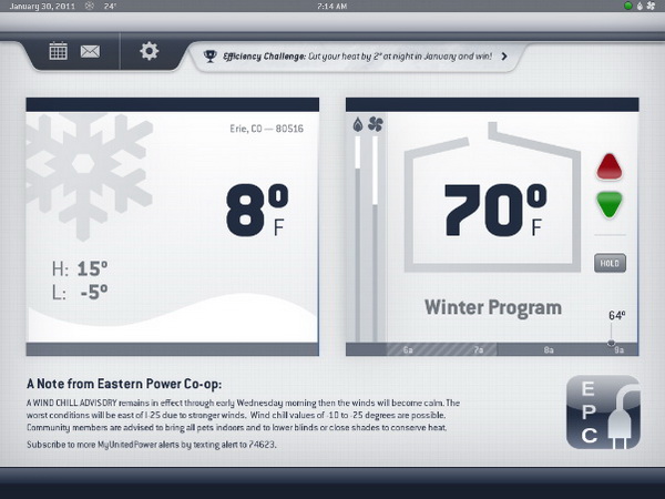 首先,我们运用了一个大尺寸的高分辨率触摸屏,可以将数据转化为图形信息并代替传统自动调温器丑陋、令人困惑的的按钮。这个办法也能让用户看到能源消费趋势,依照天气预报来设定时间表,以及从能源合作或电力公司接收更新和奖励。