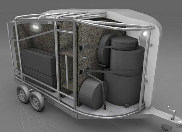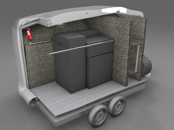 这件设计或许不太适合中国的国情,很多西方的小型乐队经常需要在全国各地巡回演出以求生存和获取灵感之类的,因为美国的高速公路不收费,因此驾车巡演是一件成本较低的方式,而且这样也更接“地气”。不过要运输整个乐队的装备(包括音响设备,甚至舞台~~)可不轻松,也不是小轿车能够承担的,因此他们需要这样的专为乐队设计的拖车。这款拖车内部设计合理,满足大部分乐队的需要,拖车外还有大片的空间用来给自己做广告,而且比大型的集装箱拖车便宜的多。