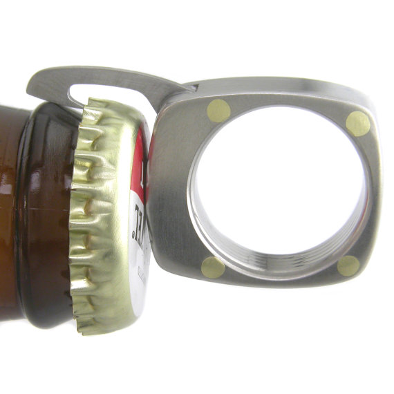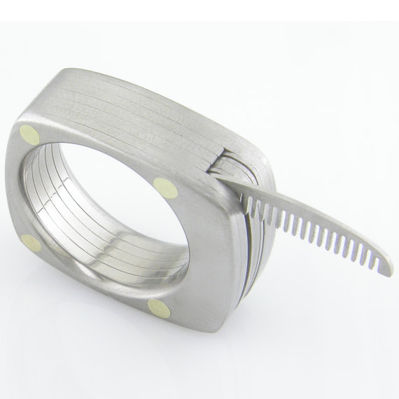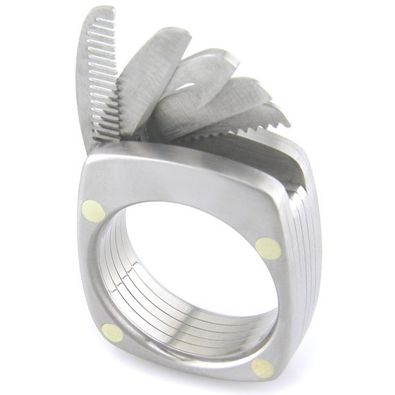 由Bruce Boone设计的一个堪比瑞士军刀的戒指,主体由航天级钛金属打造,虽然厚度只有9毫米,上面却包含了开瓶器、直片刀、锯木锯齿刀、尼龙布锯齿刀和一把小梳子。