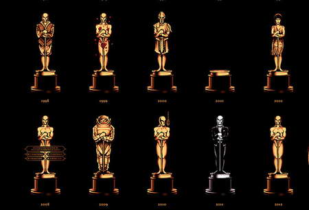 当中,上届的最佳影片《艺术家》(TheArtist)小金人穿上晚礼服,突显黑白默片特色;2010年的《国王的演讲》(TheKing'sSpeech)小金人扭过脖子,对着复古麦克风演讲;2009年描述美国陆军拆弹部队的《拆弹部队》(TheHurtLocker),小金人被设计穿上厚厚的防暴衣,十分可爱。