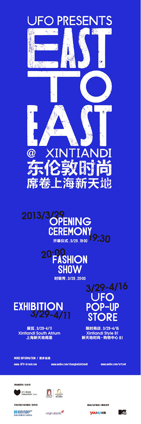 “EAST TO EAST —东伦敦时尚席卷上海新天地”设计师交流展,将于29日亮相,并掀开“MIX上海新天地2013春夏风尚季”的序幕。 此次,上海新天地将携手“东伦敦时尚教母”兼策展人刘美惠(伦敦)、策展人谢清安(台北)和全球设计师品牌运营机构UFO,邀约数十位来自伦敦东区的知名时 尚设计师,首次将“东伦敦”原汁原味的时尚创意文化带入中国内地上海,用独特的艺术语言解析东伦敦大胆前卫的时尚文化,为中外原创设计提供零距离交流平台。 参展的有知名服装设计师John Pierre Braganza,目前人气旺盛的以当代艺术与建筑为灵感的前卫的帽饰设计师Noel Stewart,利用古旧珠宝素材纯手工制作的饰品设计师Maria Zureta,与将艺术结合时尚的鞋品设计师Natacha Marro等。整个过程以展览、时尚秀、UFO POP-UP Store限时店形式呈现,期待参与者能全方位体验到来自东伦敦的创作活力与时尚气息。