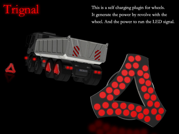 Tringal是由Yang Yong 和 Zhu Sha设计的自发电LED灯,将它装配在卡车的车轮轮毂上,不仅在夜间发光警示其他车辆驾驶者,也直观地传达出卡车的速度。安全速度时,显示绿光;快速时,显示黄光;危险速度时,显示红光。