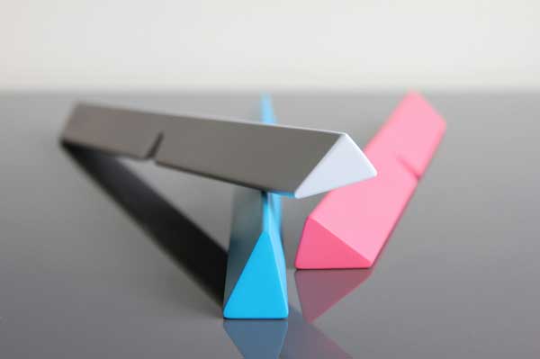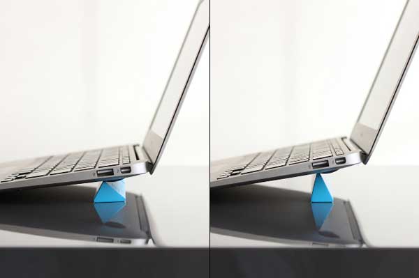 夏天马上就要来了,很多人肯定要开始为嗡嗡作响的笔记本电脑发愁了吧,改善电脑的散热性可以减小一些声音。现在市面上有带风扇的散热器,不过不太美观,而且往往加了风扇也没有多少实际的效果。这款由 Jon Liow 设计的散热板其实就可以作为一个不错的选择,它本质上就是一个三角形的塑料棒而已,可以把笔记本的一端撑起了,从而提供笔记本电脑周围的空气流通性,达到增强散热的目的。同时,它是一个异性的三角形,所以还能提供不同的支撑角度。最后,中间一个小槽可以用来收纳手机的数据线什么的。一般我都拿支笔或一本书达到这个目的。