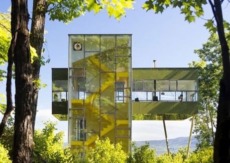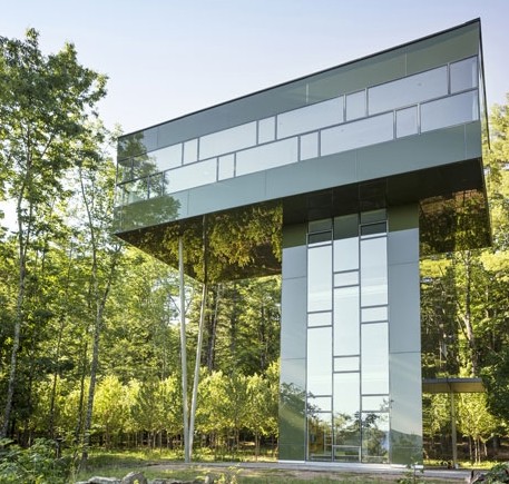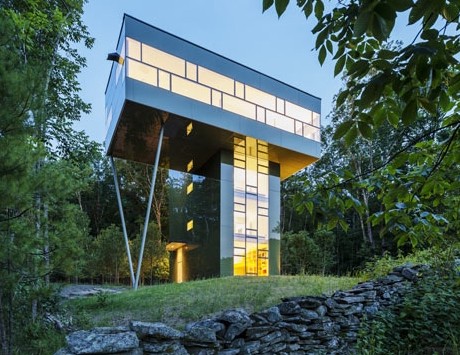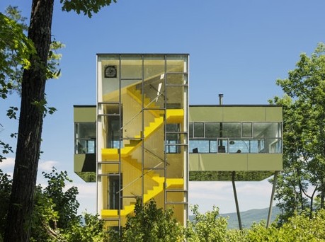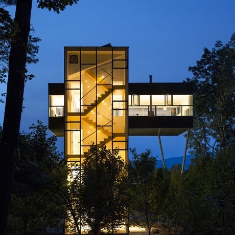 这个由美国Gluck+公司设计的度假屋位于纽约的北部地区,它的特点是有一个架高的起居室,这个起居室高出地面9米。作为Thomas Gluck(公司的负责人之一)以及他的家人的周末静居,塔屋被设计成一个拥有“鹰巢”的四层塔楼,从而使房屋拥有了穿越附近的Catskill公园的山景视野。