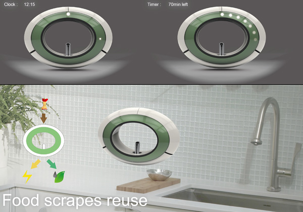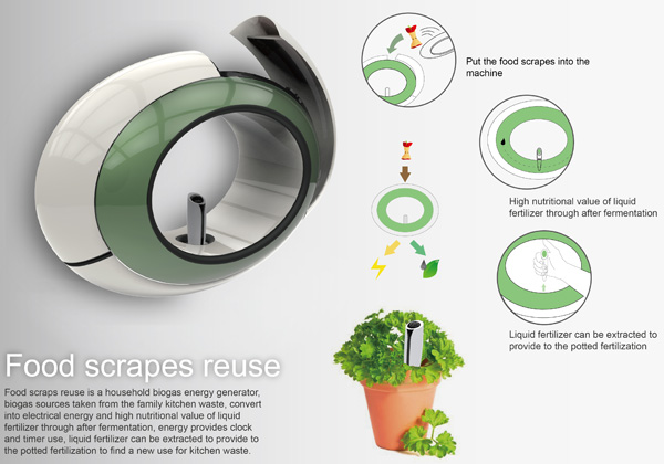 食物残渣回收 Food Scraps Reuse 装置是一款概念性的厨房设备,基本上是将垃圾处理的过程放在家庭内完成而不是送到专门的垃圾处理厂。这款设备能够利用酵母菌将食物残渣转化成液体肥料并同时产生电能,其中的电能可以用在一些小功率的家电上,而液体肥料则可以用来浇灌植物。