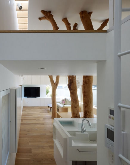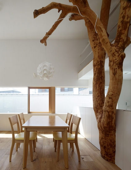 这座两层家庭住宅有35年的历史。为了给户主的女儿和她的丈夫提供一个住处,它的扩建一直延伸到花园。这两棵树阻碍了施工,必须得事先移除,但是小川博央很关心它们和户主家庭的历史关联。他解释道:“这两棵树已经照看了这个家庭35年了。”小川博央决定完好的保留这两棵树,把它们风干,再植入到两层通高的客厅&餐厅中。地板在地平面正下方下沉,以便有足够的高度放置这两棵树。