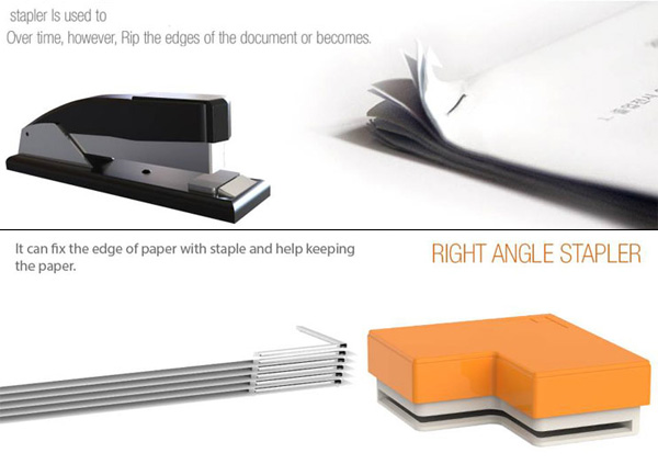 在办公室做文员的小白领们肯定会认同装订材料是一件可悲的事情(抛开有自动打印装订功能的打印机~~),因为在对齐纸张时容易划伤手指,好不容易对齐了装订的时候又会走样。这款直角订书机很简单的就能解决这个问题,它自带的一个小直角可以把纸张轻松的弄整齐,咔嚓一下就装订成功了。