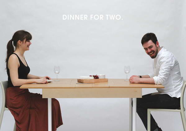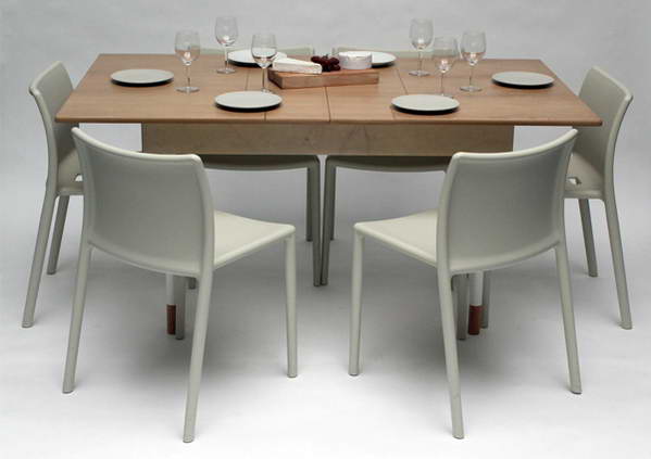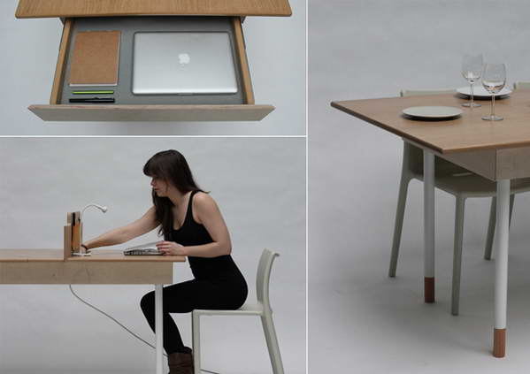 很多人肯定见过既是普通桌子又是麻将桌的多用途桌子,这里介绍的这款桌子功能稍微正式一点,它既能变成两个人的办公桌,也能当做餐桌。原理很简单,就是把桌子的中间部分设计成可以向外折叠的部分。不过这款桌子倒是非常适合喜欢看书和需要把工作带回家的家庭。