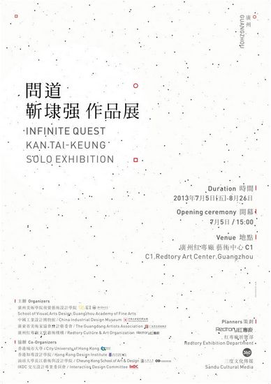 开 幕 式:2013年7月5日15:00-17:30 时间:2013年7月5日-8月26日 地点:广州红专厂C1艺术中心 主办:广州美术学院视觉艺术设计学院 中国工业设计博物馆 广东美术家协会设计艺委会 红专厂文化艺术机构 协办:香港城市大学 香港知专设计学院 汕头大学长江艺术与设计学院 I×DC交互设计专业委员会 策划:红专厂展览部 三度文化传媒