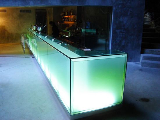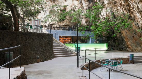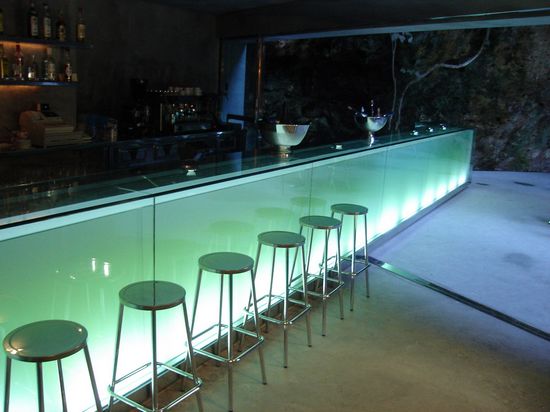 由西班牙A2arquitectos事务所设计,酒吧位于马略卡岛克里斯托港一个植物园天然洞穴的入口处,整个酒吧的核心是一个长十米的背光玻璃吧台。吧台直线条造型旨在与周围自然环境的有机形态形成对比。背光玻璃材质的属性也相反于厚重的岩石,并能让周围的访问者更加容易找到它。
