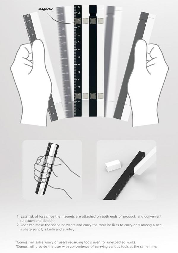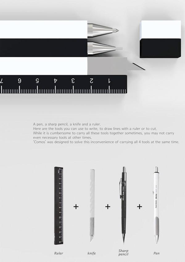 这是一套组合的办公文具用品,它是由一支钢笔、一支铅笔、一把尺子和一把文具刀通过磁力组合在一起,使用的时候只需要携带这个组合的工具就可以了,我喜欢它简单的设计和方便的可拆分系统设计。