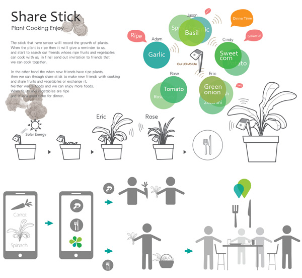 Ke chang-han设计了一款名为Harvest Matching的家庭菜园小园丁,这种智能设备能帮助使用者管理菜园,对蔬菜进行监控。当蔬菜成熟时,它会通过软件及时通知使用者。配套的手机软件不仅会向使用者报告蔬菜的生长情况,还会提出有针对性的菜谱。顶上带有一块太阳能电池板,能量自给自足,使用起来非常方便。