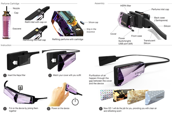 外形蠢笨的空气净化器肯定会随着科技的发展变得越来越轻薄,但到底能有多轻薄?同样入选半决赛的新加坡设计师Wei Kiat Law设计的OZ-1(便携空气调和仪),可以直接戴在脖子上。它的背面有一个夹扣,可以夹在衣领下,如果你是一个低调的人的话。不知道如此小的净化装置该使用什么技术在短时间中完成大面积的净化任务,也许设计师的想法只是保证你呼吸的每一口空气都尽可能地经过了净化吧,毕竟它戴在脖子上,离鼻孔和嘴巴颇近。OZ-1还具有香熏功能,在空气净化的过程中可以帮助你减压。为了方便搭配衣服,设计师为它设计了不同颜色的外壳。