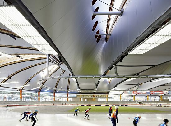该项目是由Behnisch Architekten + Pohl Architekten合作设计的Inzell速滑馆,该馆是为巴伐利亚小镇因采尔(Inzell)举办世界速度滑冰单项锦标赛而专门设计的,为了创建本次活动所需的世界一流竞赛条件,现有的室外速滑轨道通过建设一个高性能的智能屋顶结构而得到升级。这种改进后的体育馆,最多可容纳7000名观众,并为大规模的世界级比赛,以及定期的季节性速滑训练提供了最大的灵活性。