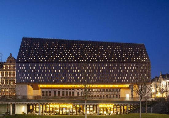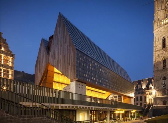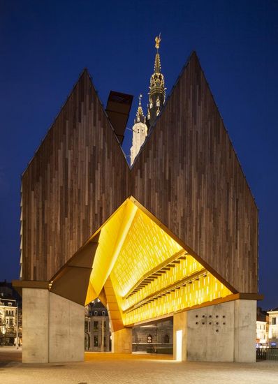 随着两次拆迁活动,根特这座历史城市的中心如今已经变成了一个荒凉的停车场,只剩下三所哥特式尖顶房子围绕在旁边。在1996年和2005年之间连续两次的竞赛,当地的robbrecht en daem建筑工作室与marie-josé van hee工作室合作设计的方案赢得了此次比赛。 方案不是仅仅提供一个开放的活动空间,他们试图精心定位市场大厅,纠正这方面的不足,并恢复了这座历史性建筑的传统样貌。该建筑本身定位于Poeljemarkt和Goudenleeuwplein之间,同时一个新的绿色连接到小酒馆,自行车公园和公厕位于大厅下面。建筑地占据24,000平方米,但它与圣尼古拉斯教堂,钟楼和大教堂相比非常吻合。并且它低于周边的塔的高度,以此来引起别人的注意。