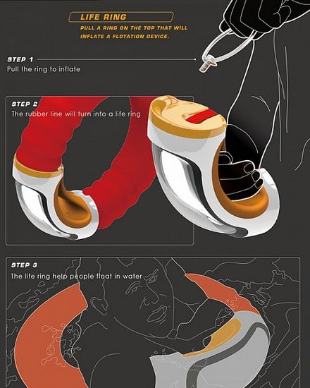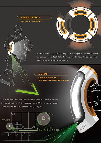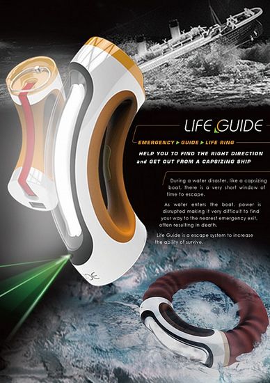 这是一个救援设备设计Life Guide,在发生水难的时候它的红色警示灯将闪烁,提醒乘客和方便乘客找找到该设备。Life Guide上有RFID (射频识别),绿色的激光射到地上指向最近的出口,方便乘客逃生,乘客也可以使用Life Guide当做手电筒。使用方法也比较简单,只要拉开设备顶部的拉环,会使设备膨胀,也就是将橡胶细绳膨胀成一个救生圈。