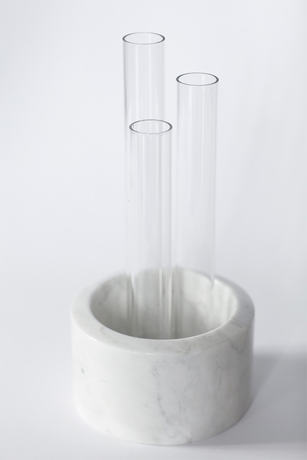 花的生长需要有一个坚实的根基,但是这款花瓶的设计,却好像让花漂浮在半空中一般。透明玻璃和乳白色陶瓷的完美结合把花的美丽衬托的淋漓尽致,无论从哪个角度看上去都是那么的干净,那么的纯洁。随着2013年伦敦设计节一部分作品的发布,这个花瓶又加入了一系列烛台的设计。简单自然的蜡烛插在这纯净洁白的烛台上,给人一种缓慢安静的感觉,也许在这超技术和快节奏的环境里,它会对你的需要提供一张满意的答卷。