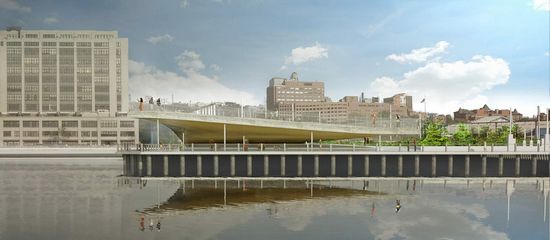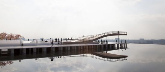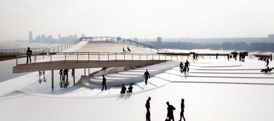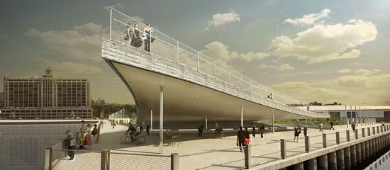 该项目是由BIG+MVVA合作设计的布鲁克林大桥公园6号码头一个巨大的三角形木质观景平台和凉亭。该设计通过一个海滨高架,蝠鲼灵感的平台,可欣赏布鲁克林的美景,项目靠近一个未来的海滩,原本设想作为纽约Blueway计划的一部分,“阶梯和波浪起伏”的结构将作为一个户外礼堂,可举办大型或小型活动。
