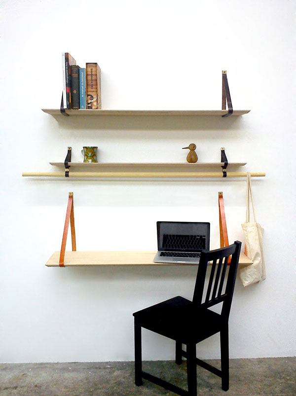 Elemotions设计的这款书架设计看上去造型简洁,但实际上内容非常丰富。它一共分为三个高度不同的部分,都是由两条手工皮革带子和一个木板组合而成,使用的时候可以将木板翻下来,两侧的带子的弹力可以很好的固定住木板,使其可以很好的支撑上面的货物,当没用的时候,可以将木板贴在墙上,相当节省空间。