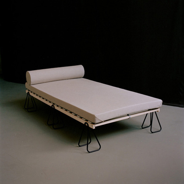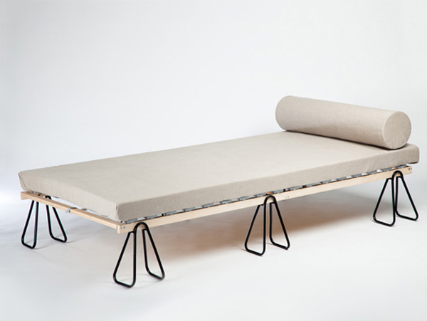 设计师迈克尔·伯纳德设计的这个支架床,简洁大方,且使用起来非常的方便。它由一个软软的床垫和枕头,一块带带木边的木板和几个金属支架组成。它最大的特点就在于它那六个金属支架的床腿,看上去有些单薄,但是使用起来非常的结实和稳定。当你不用的时候,床板可以立在一边,床垫可以收起来,床腿可以摞在一起,非常节省空间。