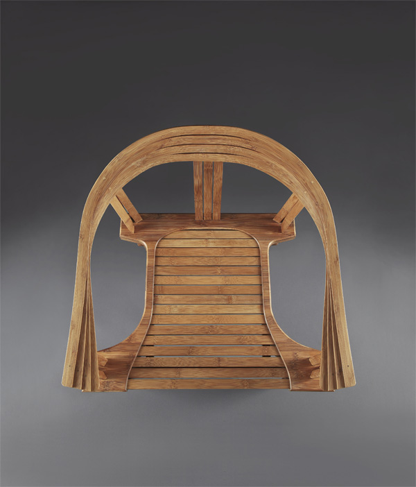 靠背自中央向两侧不间断地延伸,在扶手处向内收拢而后开展成利于抓握的扇叶型。如此大曲率的弧线涉及三度空间的扭转(正、反、侧弯),透过独特的技术应用,使竹条达至金属般不对称的延展性。