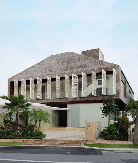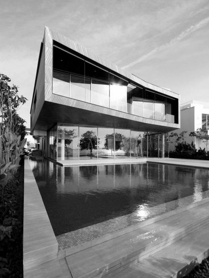 该项目是一个周末度假别墅和一个可持续发展的项目的相结合,推动Stereoscopic House的设计策略。一系列卓有成效的被动技术调和客户端的要求---大小,豪华,大方的设施,同时减轻对环境的巨大影响。 项目坐落于新加坡海峡平坦的填海景观圣淘沙岛上,Stereoscopic House夹于天然海景之中,人造高尔夫球场景观,两米的左边和右边两个相邻单位之间。悬垂体量和结构一个戏剧性的组合重新配置环境、景观和视图之间的关系。