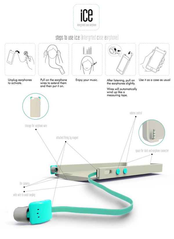 耳机可以帮助你享受好听的音乐而免于外界的干扰,但是有时候耳机也会带给你很多的麻烦。Yuljae Lee设计的这款伸缩式耳机设计将耳机和手机壳很好的结合在一起,耳机可以收入手机壳中,即节省空间,又容易找到。当你想使用耳机的时候,轻轻一拉,两个耳机就可以从手机壳中伸出来,需要多少拉多少,不用担心多余的线会缠绕在一起。