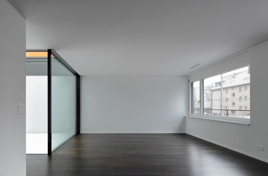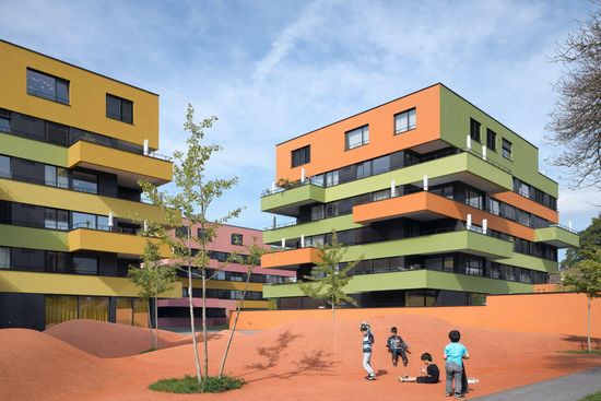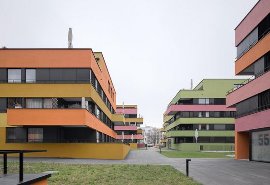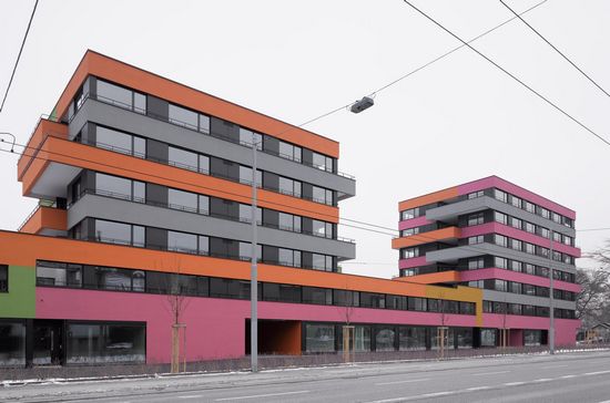 这一住宅区用不同的高度来应对苏黎世 - 阿福尔特恩周围的建筑。对道路建筑物连接在一层形成一个城市的基座,以这种方式保护建筑背后从街上的噪音。突出的大的阳台的位置(其中也有凹陷的区域)根据楼层相错开,然而雕造了该建筑体。采色护栏和窗户金属带帮助构造建筑物和其形状的发展特点。