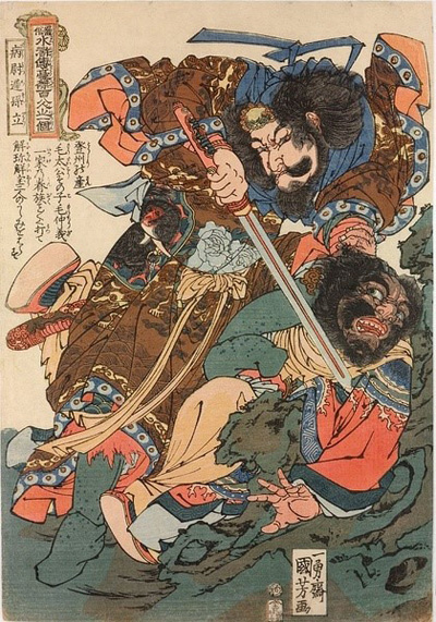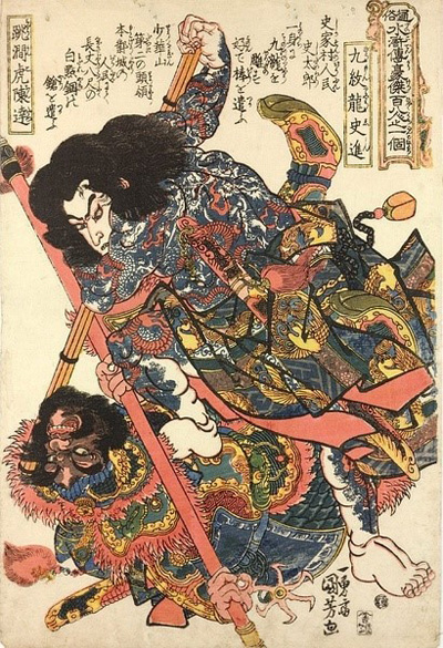 水浒传入日本后,先后被许多的浮世绘画家演绎,不过在日本的演绎中,水浒中的武松、林冲、李逵等都被描绘成了一幅武士模样,缺少了水浒传中那种鲜明的个性,而潘金莲、扈三娘、顾大嫂则被描绘成了日本艺妓的形象,兵器多被演绎为东洋刀。虽然日本的浮世绘画家将人物刻画得有一股别扭的日本味道,不过其细腻和夸张的表现手法值得称道。