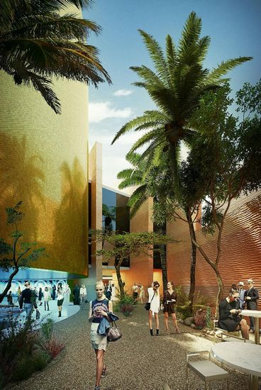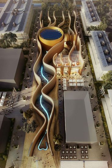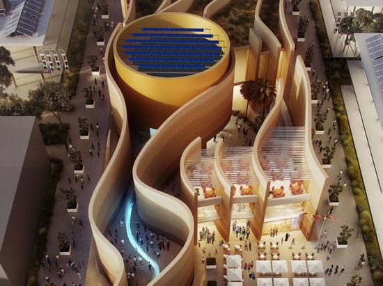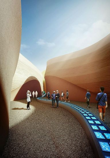 Foster和他的合作伙伴已经公布了2015米兰世博会上阿拉伯联合酋长国馆的设计。旨在唤起通过阿联酋的古社区的步行体验,细长的场地也将变成沙漠城市的当代解读。被动的原则,如雨水收集和光伏电池的集成,为达到LEED白金认证。这些策略都是为了支持展馆的许多餐饮区,涵盖了世博会的主题“给养地球”。 “重新创建国家阿联酋馆我们感到非常自豪”Norman Foster表示。“我们的挑战是两种气候–为米兰的游客创造一个自然凉爽的空间,同时考虑到该馆在阿联酋馆的最终重建,需要提供一个遮阳设施免受强烈太阳的暴晒”。 阿联酋馆,将建在世博会中心附近一个狭窄的140米的场地,将通过一个“巨大的峡谷入口进入,” Foster说,这是由两个高低起伏的高12米的墙定义。这个入口将带领游客到世博会的主要循环动脉为直觉亲密的序列,自阴影循环路径是在古老的沙漠城市的狭窄的步行街的回忆。