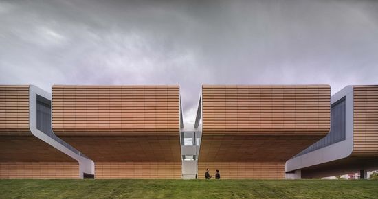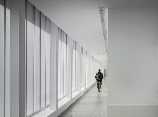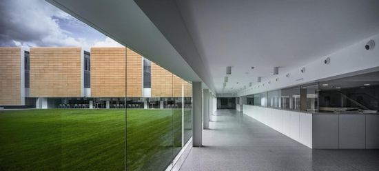 建筑设计四个层次的结构:两层地下停车场和地上三层,包含六个区域:一楼为公共区域,主要由以下几个方面:前庭区、餐厅、图书馆、礼堂、体育馆、文具、复印。教学区,位于二楼和三楼的一部分,包括学生的教室和工作坊。部门的区域,包括办公室和会议区和咨询师,在三楼。