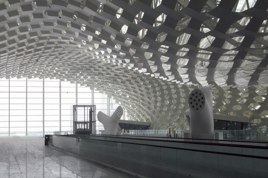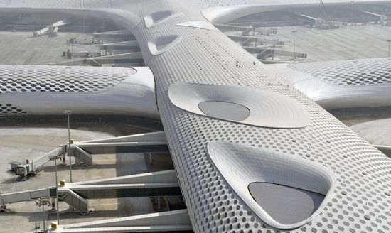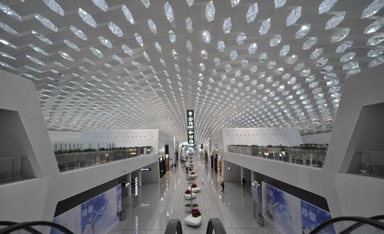 该深圳宝安国际机场3号航站楼的设计理念是把他建成一个类似于蝠鲼的形状,鱼呼吸并改变自己的形状,经过变异,变成一只鸟,从而庆祝一个飞行的情感和幻想的形象。T3的结构为一个大约1,5公里长的隧道,屋顶跨度有80米,形状好像被风吹过一样,让人想起一个有机形的雕塑形象。屋面的轮廓特点是通过其不同高度来配合周围的景观。 该项目的象征性元素是内部和外部的双重“皮肤”蜂巢图案,将其结构包裹起来。通过双分层,“皮肤”使得自然光进入,这样就产生了内部空间内的灯光效果。包层是由不同大小的小孔状的金属和玻璃面板制成,可以部分地打开。