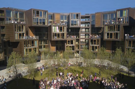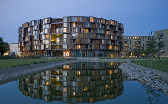 该项目位于丹麦Orestad北部,靠近哥本哈根大学。该公寓采用简单的圆形形式,与周边的建筑风格形成一致,在新规划区提供了一个大胆的建筑陈述。公寓可容纳约400名学生,它将成为国际格式的参考项目。 该项目的动态、雕塑表达是通过建筑的整体形式与个人活动的分布。建筑的圆形状是平等和社区的标志,与个人对比,项目体量表现为个人住宅。 圆柱体量围绕内庭院完成。上层沿周边安排,可欣赏到周围环境,同时均面向内庭院。公共区域找到了作为戏剧性的表达,突出的形式向内指向庭院。该住宅拥有不断变化的不同深度,给予外轮廓一种结晶特征。每个单独的住所的唯一标识从而显露出来,与圆筒形的潜力城市纪念性中和。