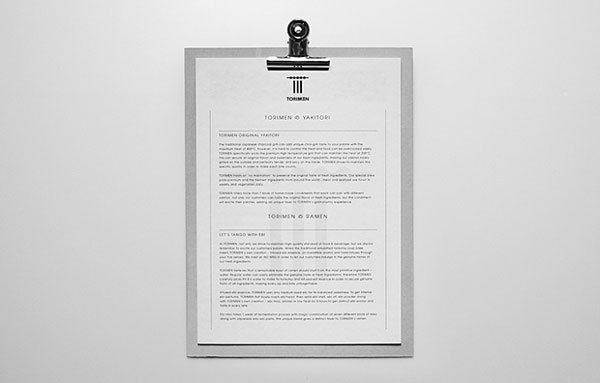 Torimen是香港中环区的一间餐厅,主营烤串和拉面。由烤鸡肉串和拉面的外形启发,设计了一个现代而独特的标志,两种设计元素贯穿店内装饰,菜单,标牌和宣传材料等。