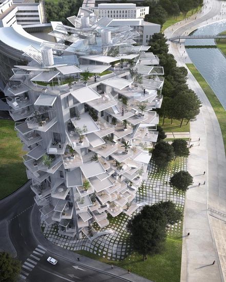新的多用途的塔称为 L’Arbre Blanc(白树),设有住宅、餐厅、艺术画廊、办公室、全景酒吧和一个共公区域。从项目的概念阶段,建筑师的灵感来自于蒙彼利埃的户外生活传统。塔位于市中心和Port Marianne和Odysseum新开发区之间。 该项目将启动一个大的手势表示的景观公园沿Lez和Christophe Colomb大堂伸出的长度。东面曲线沿回旋处的边缘在雷西侧凸创造最大可能的全景。曲率的目的有两个,因为这部分的立面提供了最佳的曝光和视点,但不遮挡相邻住宅的视线。建筑选址尊重周边环境。它完美地模仿树重塑自己成长环境,同时又提高它通过提供急需的阴影。