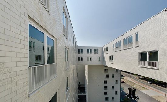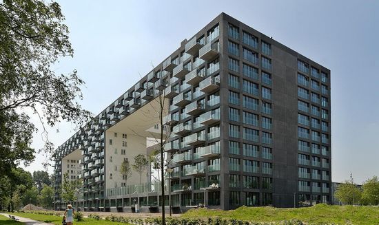 Buurt 9”(社区9)的花园城市的阿姆斯特丹西部的一部分。它由174个标准的小住房单元,是三个L形的建筑,旁边有一个小公园。 新设计的拆迁房屋成一个紧凑的但令人印象深刻的体积,从而为公园节省更多的空间。该地块轮廓的比例,135米长,34米高,34米深,可以被认为是关系到更宽敞的公园大厦一样。一个新的“国房地产”出现,增加特点到公园。 该方案包括五个塔,夹在一个大的、提出公共露台和一系列的屋顶阁楼之间。这将创建一个开放和通风的地块,并提供不同的观点,从各个方向。半公共庭院升高,使得其可俯瞰公园。